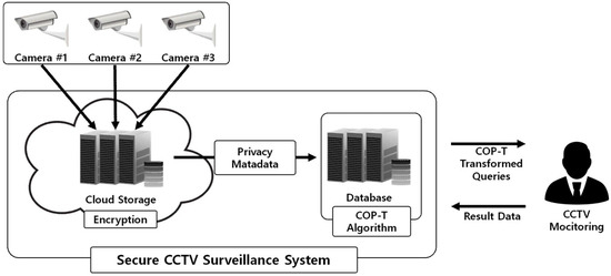 Figure 3 illustrates the proposed video security surveillance environment. In this model, the CCTV system records the video on a real-time basis and stores the image data in cloud storage. The cloud storage in the surveillance system is where video recordings are encrypted and kept. Meanwhile, the CCTV video footage is subjected to the generation of big data-based real-time meta-information which is stored using the proposed COP-transformation algorithms. In the process, under no circumstances are the data stored in a plain-text format.