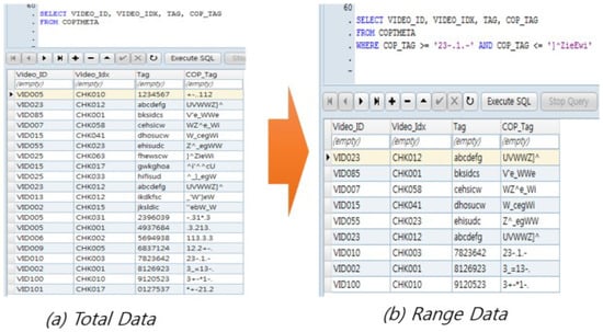 Figure 8 shows how a typical SQL (structured query language) range query is changed into a COP-transformation query. Using the COP conversion numbers, the order in plain-text files is stored at random as either forwarding or reverse, which is determined based on “u,” the output extracted in the scale transformation phase. In other words, the process characteristically changes the size of outputs during range search, depending on the result of Ri mod operations. The COP-transformation data are characterized by the application of random assignment of sorting order in plain-text files, which is either in forwarding or reverse order for each cipher of the strings. Hence, the normal query on the data is feasible only when the Ri number is known. Of note, changing the parameters will allow query (range search, aggregation, etc.) to take place even when the sorting in plain-text data is in reverse order. For instance, if users intend to bring up the upper 30th percentile of data, they will obtain the same outputs in a reverse order scenario by taking the lower 30th percentile of the data. Therefore, the proposed COP-transformation implementation is unique in that it can still execute range search and aggregation without maintaining the whole sorting in a forwarding order.