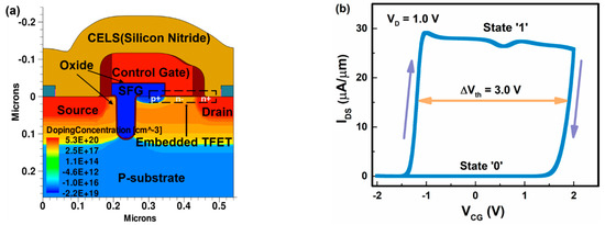 (a) Schematic of the U-shaped semi-floating gate transistor (SFGT) structure with tensile Si3N4 capper layer (CELS) and the doping contour used in the simulation; (b) The simulated transfer curve of the U-shaped SFGT device. The Vth has shifted 3.0 V when the device was switched between state 1 and state 0.