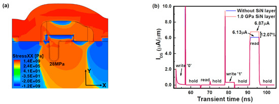 (a) Contour of stress XX along the channel direction; (b) Simulated drain current enhancement of SFGT memory with the tensive Si3N4 layer during a period of the operation sequence.
