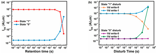 Considering the U-shaped SFGT memory array programmed by page, cells connected to columns in the same row are simultaneously operated. Thus, each cell may be subjected to disturbances from the bit-line (VD). The memory cell was first written to data 1 or data 0 and then kept in the hold state with the VCG of 0 V and VD of 1.0 V. When the neighboring cells from different rows but the same column were operated by write-0, write-1, or reading, disturbances occurred that VD was kept in disturbance conditions because of a shared bit-line. The disturbance performance shown in Figure 5b was obtained by simulating a certain disturbance time.