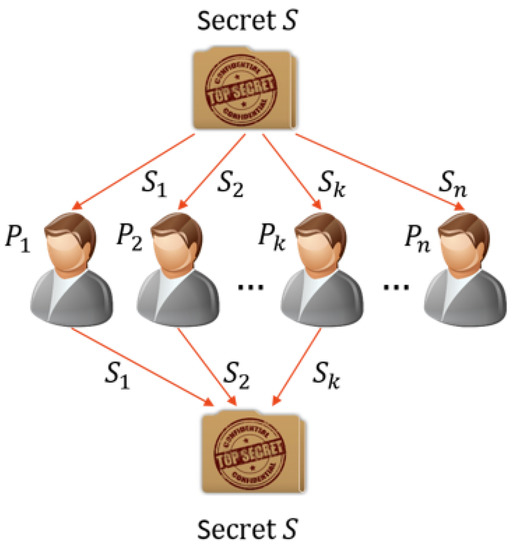 Shamir proposed the earliest concept of secret sharing [19] in 1979, in which secret S is divided into n pieces of data . Recovering the secret S requires that at least k pieces of data be combined. Based on this concept, Figure 1 illustrates a secret S held by n people who can only have one fragment (represented as –). The secret can only be recovered if k or more participants work together.