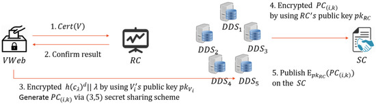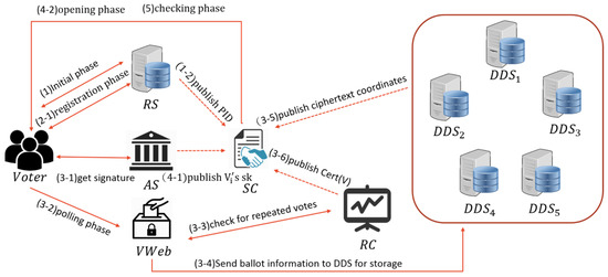 - Record center (RC): After voters have cast their votes, VWeb sends both the voting certificate and ballot signature to the RC, which then confirms that they have not cast more than one vote. If the voter passes this test, then the RC will store the voting certificate and inform VWeb that the voter’s ballot information can be delivered to DDS. At the end of the process, RC records the voter’s on the SC for further confirmation. After DDS receives the coordinates, it uses the RC’s public key to encrypt the coordinates and then records them on the SC for further confirmation if necessary.