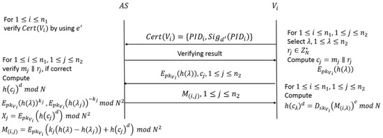- Privacy of voter : The privacy of voter ensures that AS cannot obtain any information of the ballot chosen by voter . In the voting phase, voter selects a ballot number and encrypts it to by the Paillier cryptosystem. Then, voter sends it to the AS. Even the AS knows that the range of is from 1– and can thus also compare the ciphertext after encrypting from 1–. However, it still cannot identify the corresponding ballot because the Paillier encryption process for each contains the random number selected by , thus protecting the privacy of .