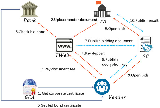 The mode of government procurement of votes has gradually transitioned to an electronic system. The emergence of electronic bidding (E-bidding) enables the relevant authority to upload its tender documents to the tender website system of the Public Construction Commission (PCC) of the Executive Yuan; bidders can then read or download the document from the system after paying a tender document fee. Additionally, if bidders also want to join, then they can upload their bidding documents after paying the deposit, and the document will be stored in the tender website system of the PCC until the opening date. On the opening date, the tender authority will determine and notify the bidding winner after reviewing the price, as well as bid bond and corporate certificates. Next, the tender authority will refund bid bonds to all bidders except the winner, whose bid bond certificate is retained for review. E-bidding has become a convenient service in past years; it aims to provide vendors with a fair bidding environment and develop a public and transparent procurement procedure to protect public benefits. Current bidding systems [8] continue to employ a trusted third party, namely the tender authority, to open and verify the bidding documents; however, the vendors who participate in bidding can only trust the credibility of the tender authority.