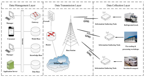 - The data management layer is mainly responsible for the implementation of real-time data acquisition, storage, display, and processing and other basic functions. It mainly includes data base, knowledge base, model base, application server, and so on. Moreover, it provides historical data query capabilities for cold chain information data, while providing easy-to-use operating and configuration interfaces for managers.