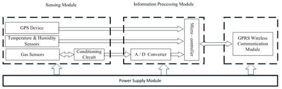 A multi-parameter information acquisition and fusion device was designed and developed to solve the problem of the multi-parameters in the cold chain environment. The hardware architecture consists of four modules that include power supply module, sensing module, information processing module, and GPRS wireless communication module (see Figure 3). Power supply module supplies power to the entire device. Sensing module captures the environmental information and geographic parameters in the cold chain by using humidity sensor, temperature sensor, carbon dioxide sensor, oxygen sensor and GPS device. The processing module processes the data that received from sensing module, and sends the data to the monitoring center via GPRS wireless communication module.