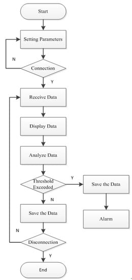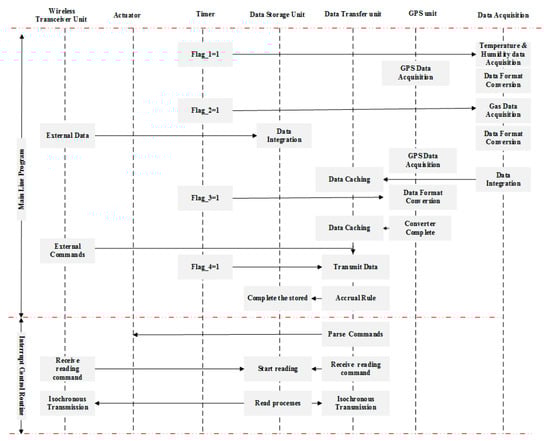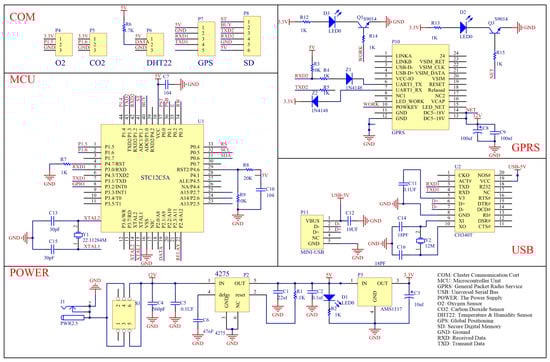 Sensing module includes temperature sensor, humidity sensor, gas sensor, and GPS device. These sensors and component (include battery, GPS and GPRS module) are directly purchased from the electronics manufacturers. This study designs its own modules. Firstly, the circuit of multi-parameter information acquisition and fusion device is developed using Altium Designer16.0 (developed by Protel International Limited), and is shown in Figure 4. Then the corresponding PCB is developed. The main line program of the multi-parameter information acquisition and fusion device is shown in Figure 5. Finally, the project completed the manufacture of hardware by PCB designing, welding, programming, and other processes.