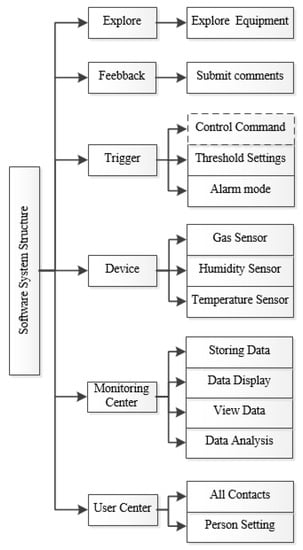 - Functional Design for Managers. The software modules include the user and monitoring centers, and device, trigger, feedback, and exploration modules, as shown in Figure 6. In the user center, the user can set personal information and account password. In device module, it has temperature, humidity, and gas (oxygen and carbon dioxide) sensors. The monitoring center module includes data display, data query, data analysis and data storage. The trigger module includes alarm mode and threshold settings, and in the future, we will continue to realize the function of remote control matsutake storage and transportation environment via mobile phone. If users have any suggestions, they can use the feedback module to submit their feedback. In the exploration module, the user can search for other Internet of Things devices. The software workflow shown in Figure 7.