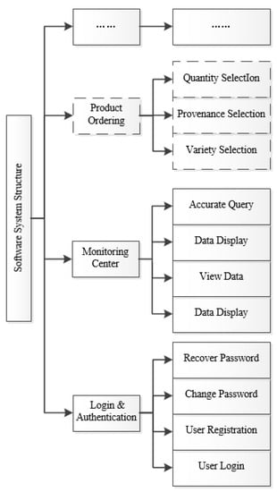 - Functional Design for Consumers. Considering consumers’ growing interest in the maturation process and quality control of the matsutake, we plan to develop application software for consumers. The module design is shown in Figure 8. In the login and authentication module, the user can set personal information and account password. The monitoring center module includes data display, data query, data analysis, and accurate query. In the future, we plan to continue to add the product ordering module to facilitate the use of consumers (for other reasons, the design of the software for consumers has not yet been completed).