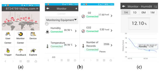 A monitoring center screenshot of mobile version is shown in Figure 10b. When the sensor device is connected successfully, by clicking the monitoring center icon, the user can obtain the real-time temperature humidity, temperature, oxygen, and carbon dioxide data of cold chain environment. Meanwhile, the user can also query the historical data of the cold chain environment by clicking the sensor device option. Figure 10c shows an example graph of the historical data of humidity. In order to enable the user to identify the anomaly of the cold chain environment in time, the software has designed the trigger module. In the trigger module, the user can set the environmental parameters threshold according to their needs. When the environmental data in the cold chain exceeds the threshold range, the software will issue warning information through the established display control, and the data font color will be displayed in red to notify the user in time.