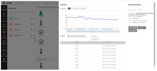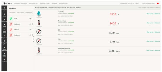 The software homepage of mobile version is shown in Figure 10a, which consists of a user center, monitoring center, device, trigger, feedback and exploration modules. Among them, in the device module, the user can add options of sensing device according to their own needs. According to the capabilities of multi-parameter information acquisition and fusion device, we added humidity, temperature, oxygen, and carbon dioxide options, then set the data upload time interval, mapping function and, finally, implement the link between the multi-parameter information acquisition and fusion device and the TLINK cloud services platform by the TCP (Transmission Control Protocol) protocol.