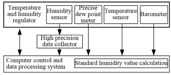 Through a large number of experimental tests, the measured error of the humidity sensor has been shown to be linear near room temperature and nonlinear at high and low temperatures. Some sensors are also nonlinear near room temperature. In the experiment, the humidity sensor was put into the temperature and humidity test chamber, which can adjust the temperature and humidity simultaneously. The standard humidity value was calculated from the measured values of the precise dew point instrument, temperature sensor and pressure gauge. The temperature at which the water vapor in the air becomes dewdrops is called the dew point temperature. The dew point temperature is a means of expressing air humidity. The standard humidity value can be calculated by the experimentally measured dew point value, temperature value and pressure value. In this experiment, the data acquisition range of the data collector was 0.1 uV–100 V, the sensitivity was 100 nV, and the error was ±0.002%. The temperature was measured by a second-class standard PT100 temperature sensor with an allowable error value of ±0.15 °C. During the experiment, all equipment and instruments were verified with high measurement accuracy and could obtain accurate, scientific and reasonable data. The measured value of the humidity sensor was read by the high precision data acquisition unit. The temperature and humidity test chamber was adjusted, and the points near the preset value were observed and recorded. The experimental principle is shown in Figure 1.