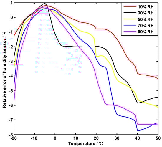 The humidity-sensitive capacitive sensor was placed in the temperature and humidity regulating chamber. The humidity was set to 10% RH, and the temperature was changed. After the temperature was stabilized, the measured value of the humidity sensor was read. The humidity was set to 30% RH, 50% RH, 70% RH and 90% RH, and the above steps were repeated. The measuring error curve of the humidity sensor at different temperatures was obtained as shown in Figure 2.