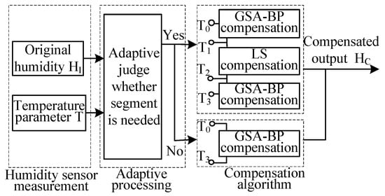 - The adaptive segmentation compensation method combines the simplicity and efficiency of the least squares method with the high precision of the GSA-BP neural network. The measurement error of humidity significantly improved over the entire temperature range. In the vicinity of the segmentation point (22.36 °C, 29.98 °C) obtained by the adaptive calculation, the compensation effect is particularly significant.