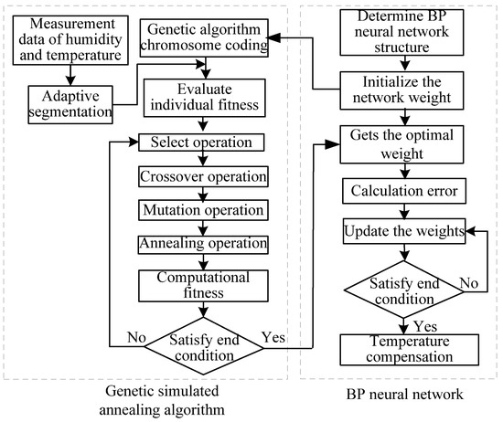 The nonlinear interval adopts the BP neural network with strong nonlinear mapping ability to compensate. The input of the BP neural network is temperature and the measured value , and the output is the compensated humidity value . The humidity sensor temperature compensation model was established, and the BP neural network was trained by multiple sets of data. To improve the local minimum of the BP neural network, a genetic simulated annealing algorithm was used.
