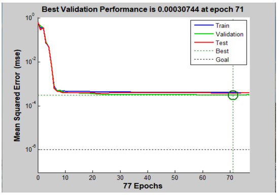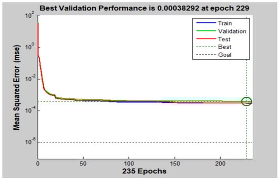 It can be seen from Figure 6 that when the GSA-BP neural network evolves to 70 generations, its adaptation value reaches a minimum, the optimal weight and threshold of the BP neural network are found, and the number of termination iterations is 77. In Figure 7, the number of iterations of the BP neural network is 229. It can be seen that under the same conditions, the number of iterations of the BP neural network optimized by GSA is small, and the training speed is fast, which indicates that the BP neural network optimizes the operation efficiency significantly.