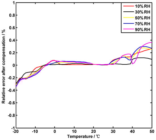 The multiple linear regression method is used to analyze the humidity measurement errors at different temperatures. For the intervals with better linearity, the multiple regression model established by Equation (4) is used to compensate the errors.