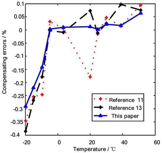 - The overall trend of the compensation effects of the three methods is the same. The compensation error used in reference 11 is large, and the error at the segmentation node significantly increased. The compensation effect of the method in this paper is relatively stable. In particular, the curve between 0 and 40 °C tends to be gentle and close to zero.