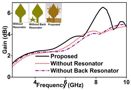 The existence of parasitic elements and staircase diamond shape of the patch and optimum ground plane has a strong effect for the impedance matching. By adding the star-shaped parasitic elements, the side lobe level is simultaneously reducing, and gain in the main lobe is increased and corrects the squint effects which provides improvements in radiation characteristics. The parasitic elements promote the main radiator optimal conditions to avoid the trapping. Slot edges improve the radiation characteristics due to the control of surface current distribution near the lateral antenna edges. Figure 2 presents the effect of the parasitic resonator on the reflection coefficient. It shows that the parasitic resonator has a strong effect both in lower and upper bandwidth enhancement. The modified structures by using resonator and staircase patch extended the usable upper frequency by about 600 MHz (shifted from 9.7 to 10.3 GHz), and the lower frequency is decreased by about 700 MHz (shifted from 3.4 to 2.7 GHz). The gain of the antenna for the different structure is portrayed in Figure 3. The figure concluded that the gain is higher for proposed configuration than others. The peak gain reached 6 dBi from 4 dBi by using the parasitic resonators. The use of parasitic elements creates some extra current conducting paths. This structure changes the capacitance and inductance of the input impedance of the prototype, which leads to changes in the antenna characteristics.