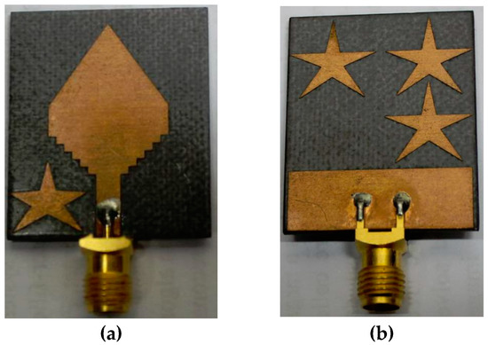 The geometric layout of the proposed antenna is shown in Figure 1. The proposed antenna is designed on Rogers RT/Duroid 5880 substrate material having 2.2 dielectric constant and 0.0009 loss tangent. The antenna is designed with a diamond-shaped patch, partial ground plane and star-shaped parasitic elements on the substrate. The diamond-shaped patch with incremental staircase design is used as a main radiating element of the antenna. The overall dimension of the antenna is 30 × 25 × 1.6 mm3. The height and width of the ground plane are 6.5 mm and 24 mm. The feedline is 3.0 mm in width and 8.0 mm in height. The feedline is directly connected to the diamond-shaped patch. The designed antenna is fed by a 50 Ω microstrip line. Three parasitic elements are positioned above the ground plane, and another one is placed beside the feedline.