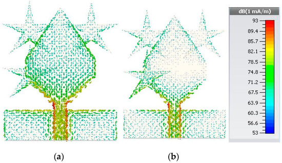 The simulated vector current distribution at: (a) 5 GHz and (b) 9.47 GHz.