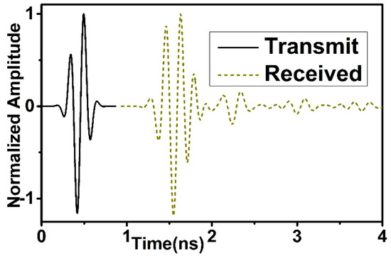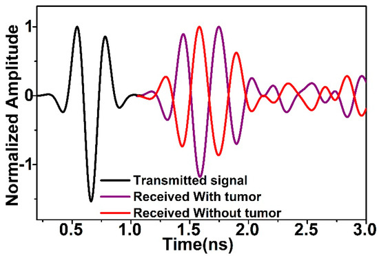 The imaging performance of the prototype was observed based on various parameters including analyzing the backscattering signal propagation, normalized magnitude with and without a tumor present inside the breast phantom and near field directivity (NFD). The system setup for breast phantom screening is shown in Figure 9 where nine antennas are surrounding the phantom. One prototype is acting as a transmitter, and the other eight are a receiver. The breast phantom consists of breast tissue layer and skin layer. The breast tissue layer is 8.75 cm thick, and the dielectric constant is 5.14 with a conductivity of 0.141 S/m. On the other hand, the skin layer is 2.5 mm thick, and the dielectric constant is εr = 38 with 1.49 S/m conductivity. At 6 mm depth inside the phantom a 10 mm diameter tumor cell has been placed which has a high dielectric constant of 67 because of the presence of a higher amount of water content. The main aim of this system setup is to observe the change of the backscattering signal with and without the presence of a tumor cell. The normalized magnitude of two different setups is shown in Figure 10. It is identified that the received pulse of the two-different setup has two different phases of signal propagation.
