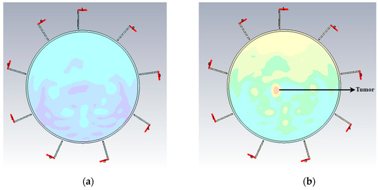 This is the proportion of radiated power inside the phantom (Pf) and the radiated power across the surface of the phantom (PT). Figure 11 indicates that the NFD factor for the proposed imaging setup is about 64%. That means about 64% of power is radiated through the breast tissue. The images constructed by analyzing the change of backscattering signals are shown in Figure 12. The imaging of the phantom without tumor is illustrated in Figure 12a, and the results with the presence of the tumor are presented in Figure 12b. For the higher dielectric properties of the tumor, the received signal at the point of the location of the tumor is identical than that of normal breast tissue.