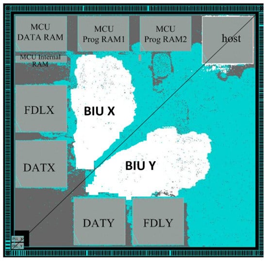 In the pin arrangement, the pin of the two BIUs is symmetrical relative to the 45-degree diagonal. In layout planning, the two PLLs (i.e., PLL_X and PLL_Y) are placed at the edge corner of the chip. The logic unit (i.e., BIU X and BIU Y), instruction SRAM (i.e., FDLX and FDLY) and data SRAM (i.e., DATX and DATY) of the two BIUs are distributed symmetrically based on the 45-degree diagonal line of the chip, so that the wiring of the two channels is completely consistent. Other IP modules are laid out according to the timing requirements.