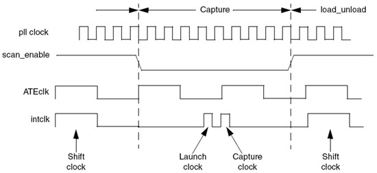 First of all, it can reduce the requirement of test equipment, which only needs to provide a low speed reference clock. Secondly, the test mode has a high probability of register flipping and high-power consumption. When OCC structure is used, shift clock is low frequency and only capture clock is high frequency, which can avoid the damage to the circuit caused by excessive power consumption. Finally, the manufacturing defects in deep submicron process can be found in the at-speed test as a supplement to the stuck-at fault test [20]. The OCC structure can be automatically inserted with DFT Compiler, and its timing waveform is shown in Figure 5.