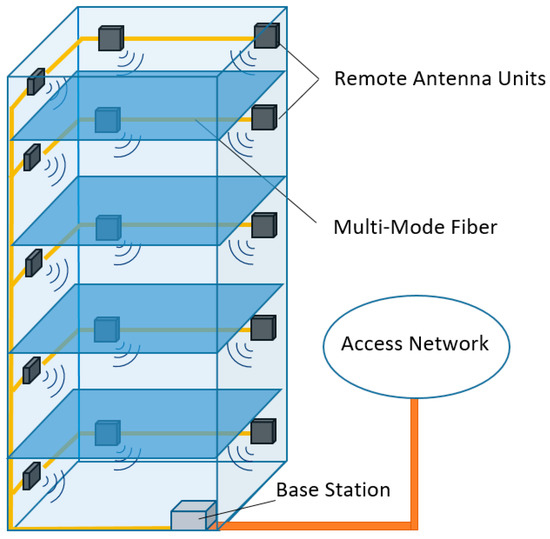 The interest in mixed fiber-wireless systems has grown in recent years, especially for short-range indoor applications, which can benefit from radio-over-fiber (RoF) distributions, as is the case with distributed antenna systems (DASs) [1,2]. These systems are flexible and there is a good compromise between data capacity, accessibility, and the overall cost of installation and maintenance, allowing for a good convergence of optical fiber capacity and wireless access flexibility [3]. The system operation consists of distributing the signal through multi-mode fiber (MMF) from a base station (BS) to distributed remote antenna units (RAUs), which provide an optical-wireless interface (see Figure 1). To decrease the effects of fiber chromatic dispersion, the wireless signals can be down-converted before the optical transmission, employing an intermediate frequency (IF) communication scheme [4].