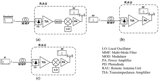 Figure 2. Conceptual scheme of the downlink of remote antenna units for (a) baseband over fiber, (b) radio over fiber, and (c) intermediate-frequency over fiber.