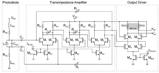 16. Razavi, B. Transimpedance amplifiers. In Design of Integrated Circuits for Optical Communications; McGraw-Hill: New York, NY, USA, 2003; pp. 89–97. [Google Scholar]