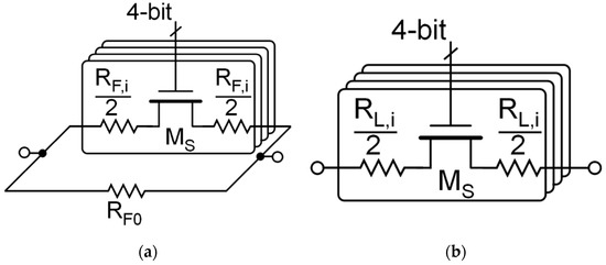 Figure 4. Implementation of the 4-bit programmable resistor arrays (a) feedback resistor, R F , and (b) load resistors, R L , i .
