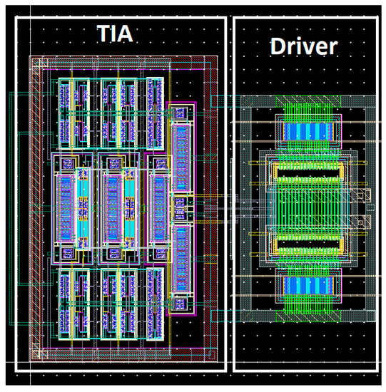 Figure 6. Layout of the active area of the transimpedance amplifier and the output driver.