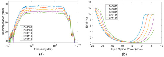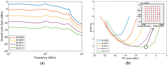 Figure 7. (a) Overall link frequency response and transimpedance of the TIA and (b) measured error vector magnitude (EVM) as a function of the input RF power for each transimpedance configuration. Data from [14].