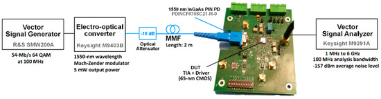 Figure 7b shows the measured EVM versus the equivalent input optical power of the signal, at each transimpedance state. The electrical measurements have been performed using a vector signal generator (VSG, Rohde & Schwarz SMW200A) and analyzer (VSA, Keysight M9391A). The TIA presents an EVM lower than 2% for an input RF power range of 40 dB, from −60 to −20 dB, which corresponds to an optical input of −16 to +4 dBm. Noise simulations have been made to take into account only the TIA noise, which exhibits an EIN of 2   pA / Hz . The power consumption of TIA alone is 6 mW.