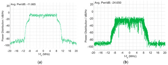 Figure 9. (a) Input spectrum of the integrated optical receiver with f c = 100 MHz. (b) Output spectrum of the integrated transimpedance amplifier.