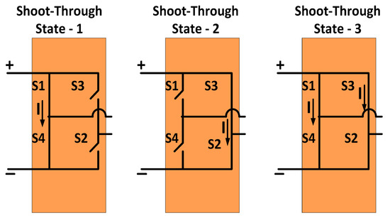 The ST state is initiated by closing the S1–S4 or S3–S2 of the converter. The ST state can be achieved in three ways, as shown in Figure 4. ST state-1 can be achieved by closing the first and fourth switches, ST state-2 by closing the second and third switches, and ST state-3 by closing all the switches. Any one of the ST states can be used to obtain the shoot-through. The ST time duration decides the magnitude of the boost in the output voltage. Therefore, any one of the ST states is implemented in the converter or inverter circuit to produce a higher-value load voltage. The ST state is not required for buck mode operation where the output AC or DC voltage is less than the input DC voltage.