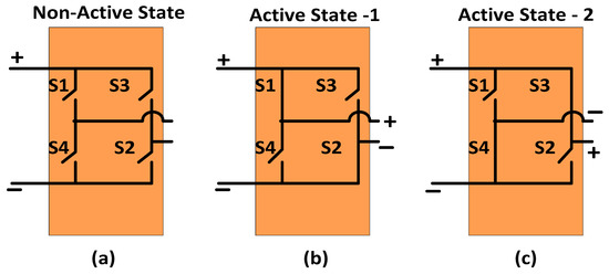 In the non-active state, all the switches are open. Therefore, no energy is drawn from the supply, and no energy is supplied to the load. During active state-1, S1 and S2 are turned on, then the load receives positive voltage; in active state-2, S3 and S4 are turned on, then the load receives negative voltage. Figure 5 shows the non-active and active states. The non-active state and active state durations determine the output voltage in buck mode, whereas the ST duration along with the active and non-active durations determines the magnitude of the output voltage in boost mode operation. On the basis of the load requirement, the DAD converter output is switched over between AC or DC with buck or boost in the load voltage for the given DC input supply.