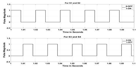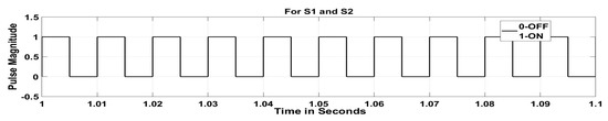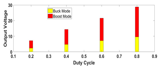 The converter mode of operation operates as a DC–DC boost or buck converter. In buck mode, by keeping switches 3 and 4 open and controlling switches 1 and 2, the output voltage can be controlled, as shown in Figure 8. In buck mode, the output DC voltage is: