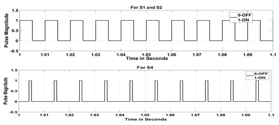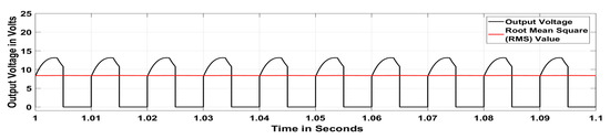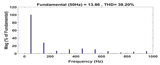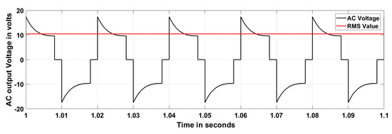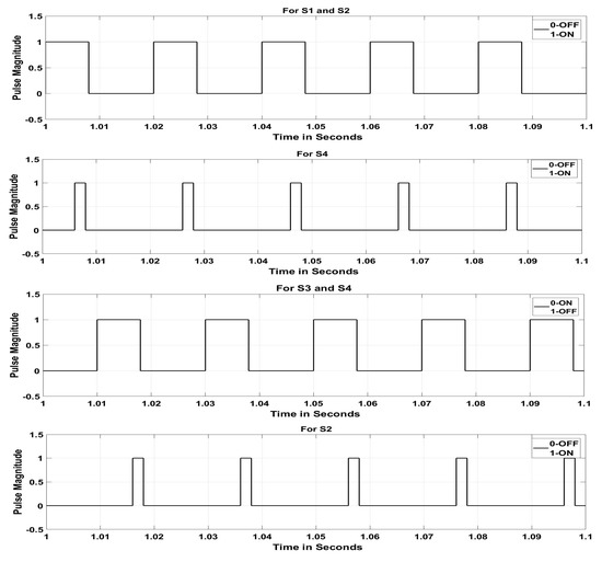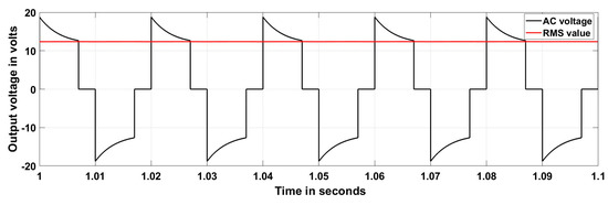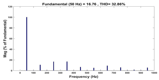 Figure 15 and Figure 16 show the control pulse and output AC voltage of the DAD converter in buck mode operation with a modulation index of 0.8 and without ST timing. The Fast Fourier Transform (FFT) analysis is depicted in Figure 17 to understand the harmonic components. By introducing the ST timing of 0.004 s, the same buck inverter acted as a boost inverter. Figure 18 and Figure 19 show the control pulse and output AC voltage of the DAD converter in boost mode operation with a modulation index of 0.8 and ST timing of 0.004 s. Figure 20 provides the harmonic analysis of the output AC voltage. This buck–boost feature in both converter and inverter modes increases the suitability of the DAD converter for photovoltaic systems by eliminating the number of power converting stages in distributed generating systems [18,19,20,21].