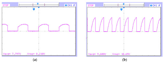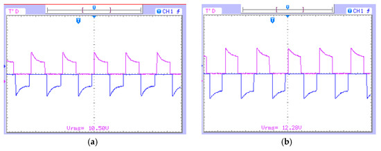 Experimental output voltage waveforms for an input DC voltage of 12V: (a) Output voltage of DC–DC buck mode with D = 0.5 (b) Output voltage of DC–DC boost mode with D = 0.5 and ST = 0.1. (Voltage: 10 V/div, Time: 10 ms/div).
