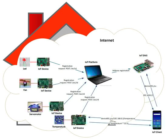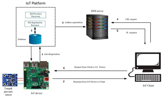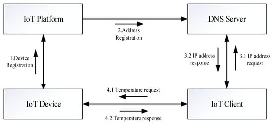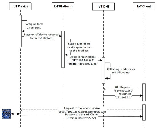 Figure 2 shows a sequence diagram for the proposed system architecture. Firstly, the IoT device local parameters are configured. When the IoT device is connected to the IoT Platform, the device sends IoT device resource values to the IoT Platform, and IoT Platform collects all the information about the IoT device to its database. After that, the IoT platform sends a request for address registration to the DNS server (IP address and URL name). When the client tries to connect to the IoT device, he or she sends a request with the URL name (device001.jnu) to the client. Moreover, the request comes to the DNS server, and the DNS server selects a proper IP address (192.168.0.2) from its mapping table according to the URL name, after local IoT DNS sends an acknowledgment with the IP address. After taking the IP address, the IoT client can be able to access the indoor environment, and the IoT device sends the temperature of condition to the client {“temperature”: ”22,5”}.