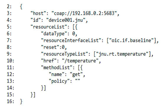 Figure 3 describes an example of IoT device registration resources to the IoT Platform. The given properties provide information which is utilized for discovering IoT devices over the Internet by clients. The properties of the structure are based on common properties of the OCF IoTivity core specification that is a unique format for registration of IoT devices. These values consist of “host,” “device id,” resource list, resource interface list, resource type list and list of methods. As can be seen, “host” is an IoT device IP address and a host number, “id” is a unique identifier of the device, and it is relatively used with “href” in order to get endpoint information. Items in the “resources” play a role in providing a request by IoT clients: “dataType” are derived JavaScript Object Notation (JSON) values. The data types can be adaptable for a specific utilization; for instance, the string length can be changed for a particular condition. The “oic” is utilized for OCF defined interfaces, as well as, it is accepted as the first segment in the Interface property value. The “oic.if.baseline” is applicable in RETRIEVE, UPDATE methods and used for defining a view into all properties of a resource. The “policy” parameter provides diverse rules for reliable accessing to the resource. This parameter is configured by the setting of “key-value” pairs. OCF defined resource types and interfaces are specified using JSON and RESTfull API Modeling Language (RAML), respectively.