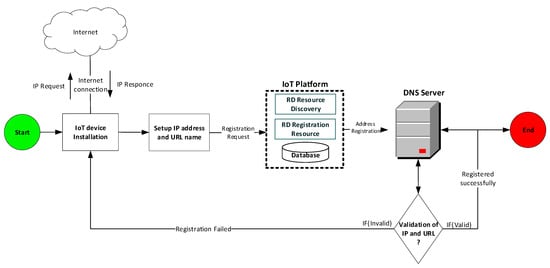 Figure 5 describes the flowchart of the IoT device registration to the DNS server. First of all, the IoT device is installed to the home, workspace or required place after it is connected to the Internet through a wired or wireless connection. When the device is connected to the internet, the device needs a unique IP address over the network. Usually, IP addresses are chosen dynamically through a DHCP server because a manual method for applying IP addresses is cumbersome, as remembering all the clients and their IP addresses in one host is impossible. After taking the IP address successfully, the IoT device sets up an IP address and URL name. Then, the IoT device sends a registration request with the URL name, IP address, as well as some other parameters of the IoT device such as resources list, resource interface list, resource type list and method list to the IoT Platform.