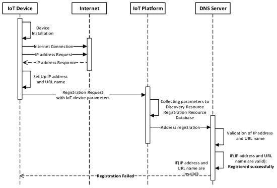 The Resource Directory in the OCF Platform can provide a discovery service which allows devices to publish their resource value information to an RD, and updates resource information and allows deleting of resource information from the resource directory []. Figure 6 describes the sequence diagram of the device registration process. First of all, the IoT device is installed and connected to the Internet, after connection to the internet router gives an appropriate unique IP address to the IoT device, and this IP address and URL name become related to this IoT device. After that, the IoT device sends a registration request to the IoT Platform with IoT device parameters. These parameters are collected to the RD Resource Discovery, Registration Resource and Database. The IoT Platform plays a role as a bridge; it collects all of the IoT devices in its host. The next step is sending a request to the DNS server for Address Registration. The DNS server validates all IP addresses, URL names and if they are valid in this network the DNS server registers the IoT device successfully. If there are some invalid parameters in the registration process, registration fails and the IoT device should be reinstalled.