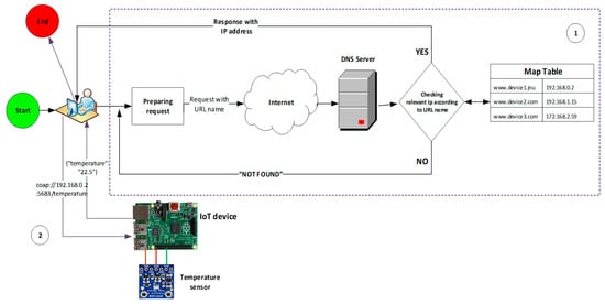 Figure 7 illustrates a general overview of the device discovery and sensing data response process of the proposed system. The figure is divided into two parts: the first part describes the device discovery and taking the IP address from the DNS server; the other part shows the process of the sensing data from the IoT device. As we have explained above, the client sends a request to the IoT DNS server for getting an IP address, and the DNS server checks its Map Table and response with an appropriate IP address according to the URL name. After getting the IP address, the client is able to send a request to the IoT device (coap://192.168.0.2:5683/temperature), and the IoT device sends a response with indoor temperature.