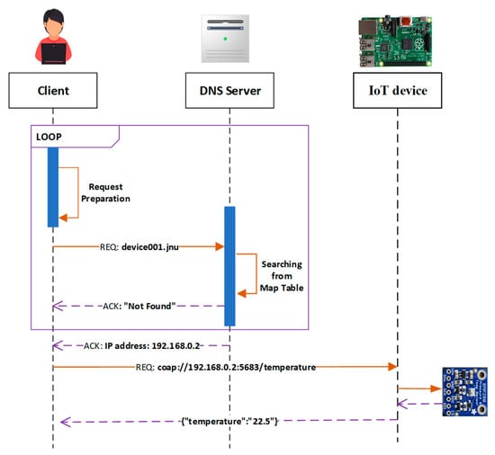 Device and resource discovery are provided by CoAP endpoints. This function is critically essential in the M2M applications, in which there is no people’s role in the process, and there is a vulnerability due to static interfaces. CoRe Link Format provides resource discoverable services without fully manual configuration for improving interoperability in a CoRe environment. This process depends on the server in which discoverable resources are used. Figure 8 describes the sequence diagram of the device discovery. Firstly, the client makes a request preparation, he or she opens a browser, enters the URL name to the address bar and clicks enter. In a sequence diagram, the client sends a request with device001.jnu URL name and send it to the DNS server. After that, the DNS server searches this URL name in its Map Table. If there is no equivalent IP address according to the URL name in the Map Table, the DNS server sends a “Not Found” message, this process describes the loop process, and it will continue until the client enters the available URL name. When the DNS server finds a valid IP address according to the URL name, it sends an acknowledgment with an IP address such as 192.168.0.2. When a client reaches the IP address successfully, he or she can send a request to the IoT device. The IoT device sends an acknowledgment with temperature.