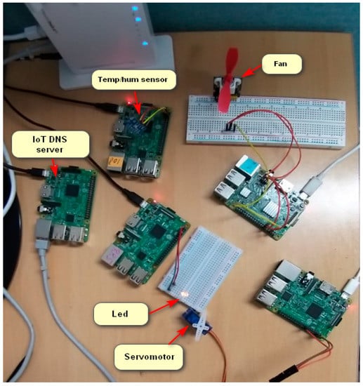 Figure 9 presents the environment of the experiment which consists of the OCF Platform and the Internet. For internet connectivity to the system, we can use LAN such as Wi-Fi. Additionally, the system includes the IoT client, IoT DNS and IoT devices, which are connected with each other through OCF protocol in the LAN. In the implementation of the local IoT DNS server; the IoT client can use his or her Android phone which is provided with the User Interface for interacting with the clients. The IoT devices are Raspberry Pies which are connected to the BME 280 temperature sensor, fan, LED and servomotor, which are utilized for providing indoor smart services.